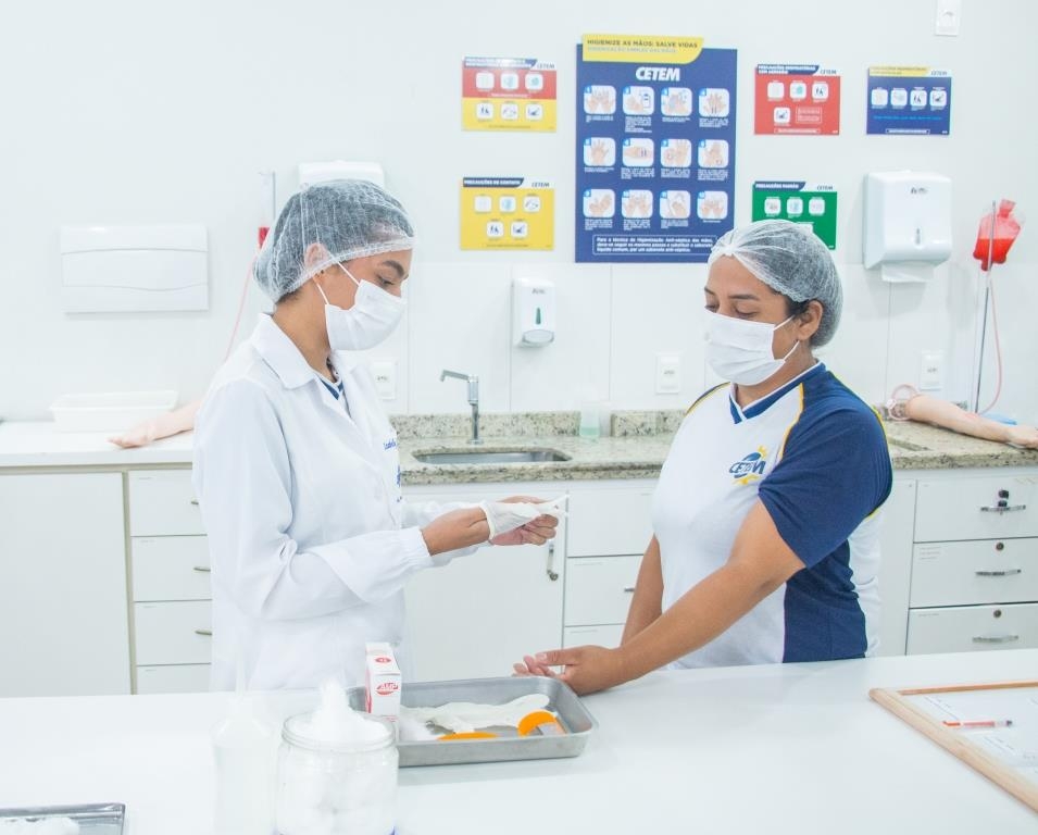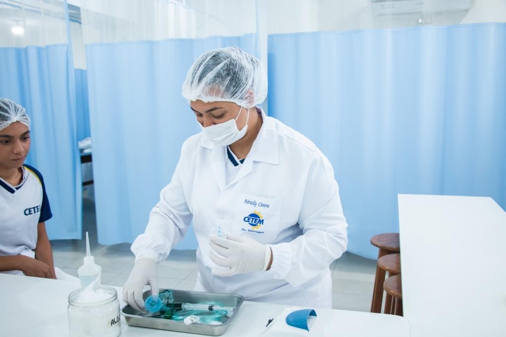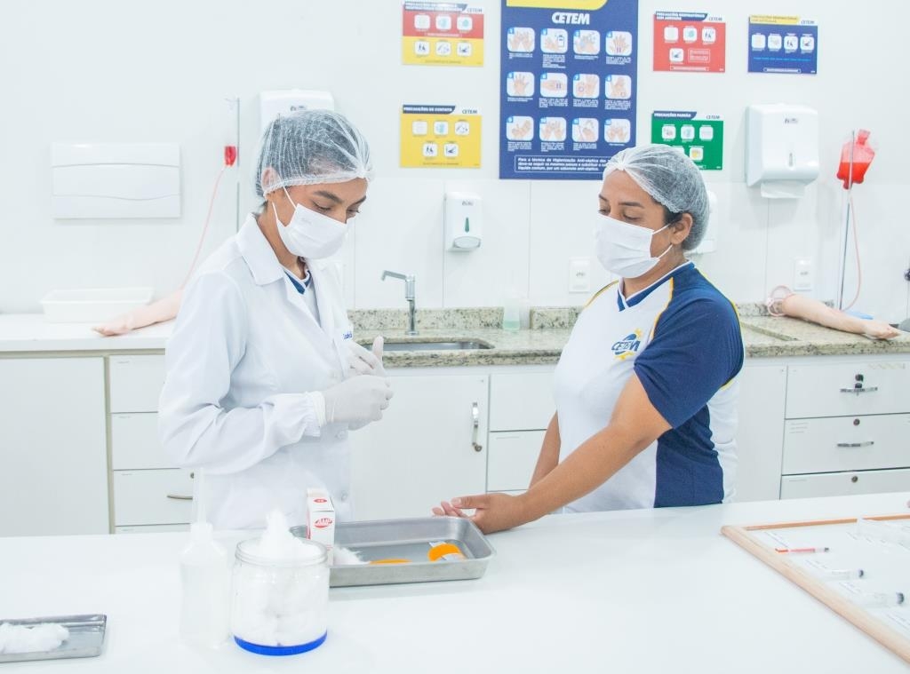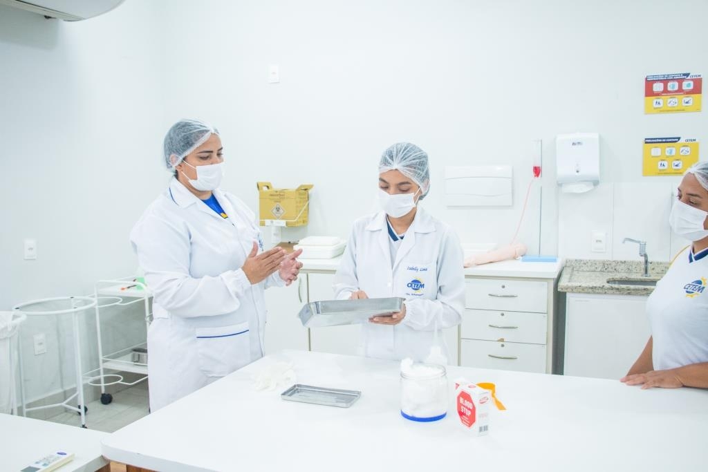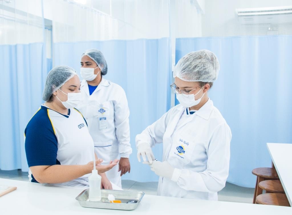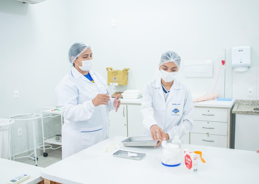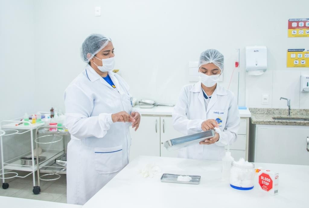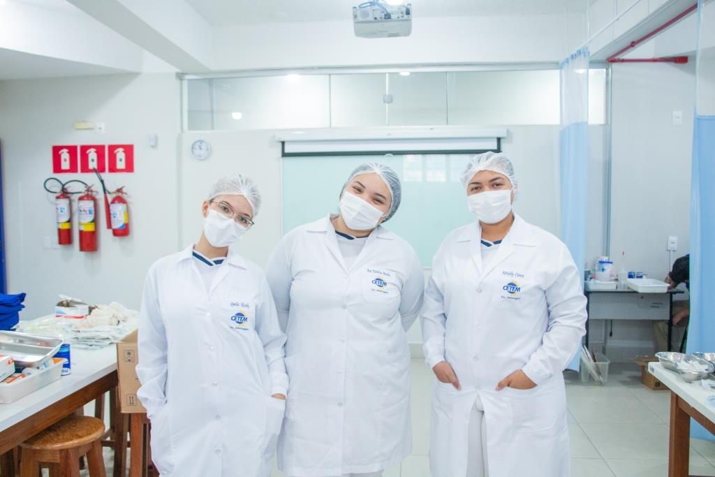Aula prática das alunas do curso Técnico em Enfermagem no laboratório