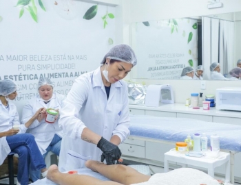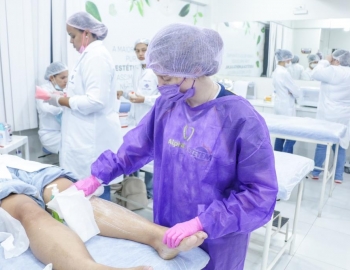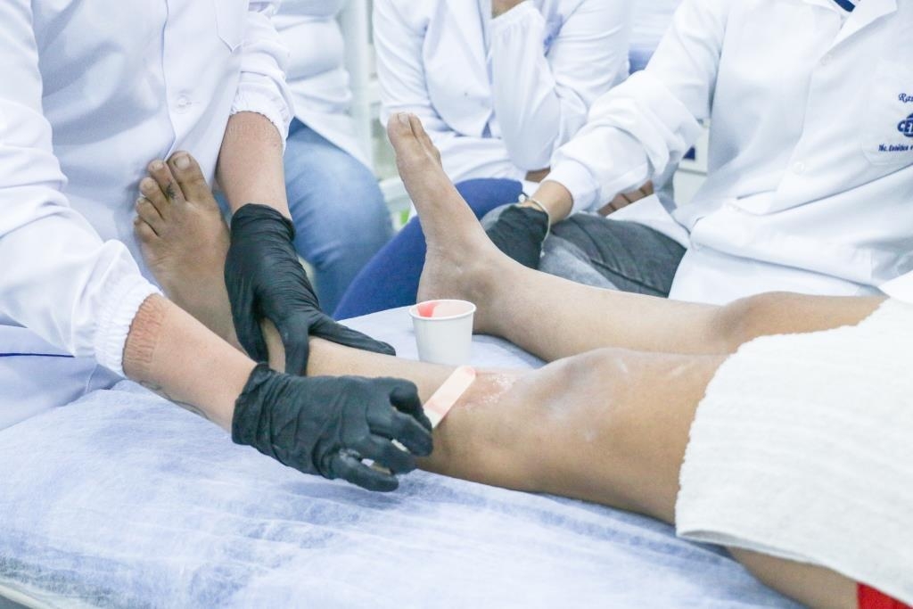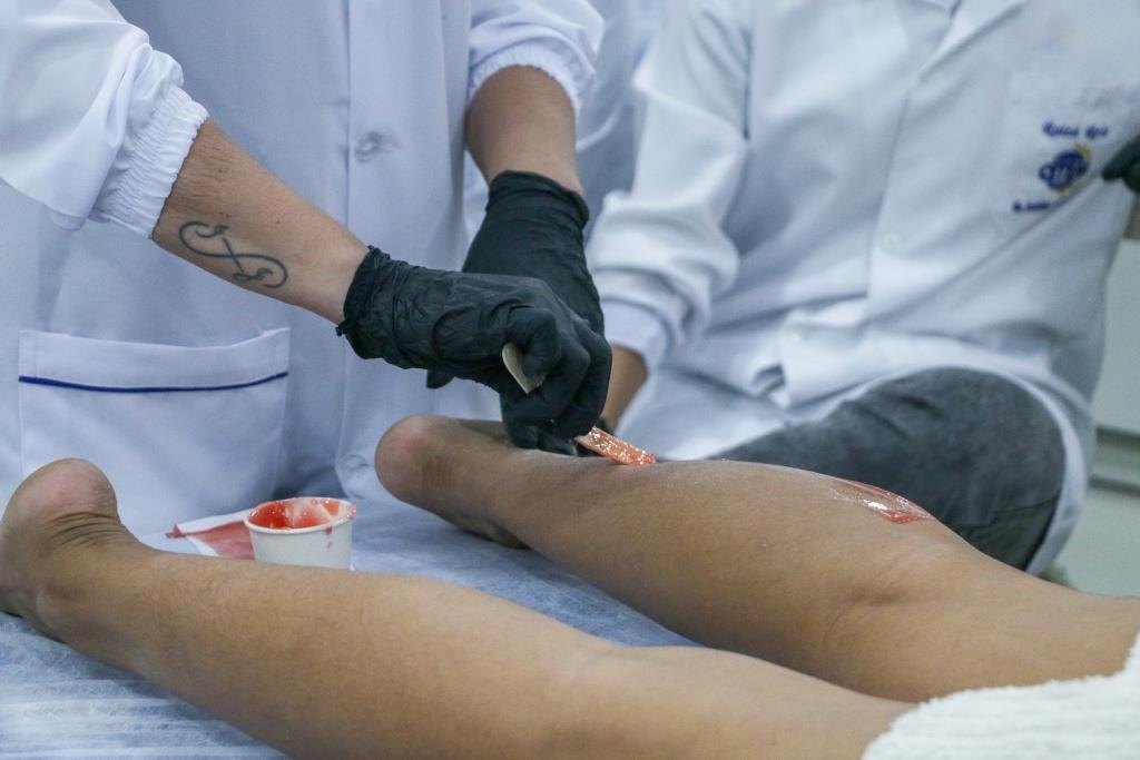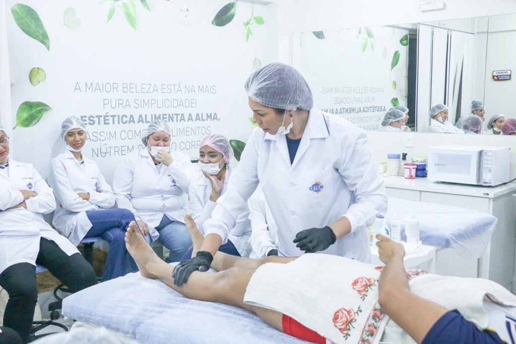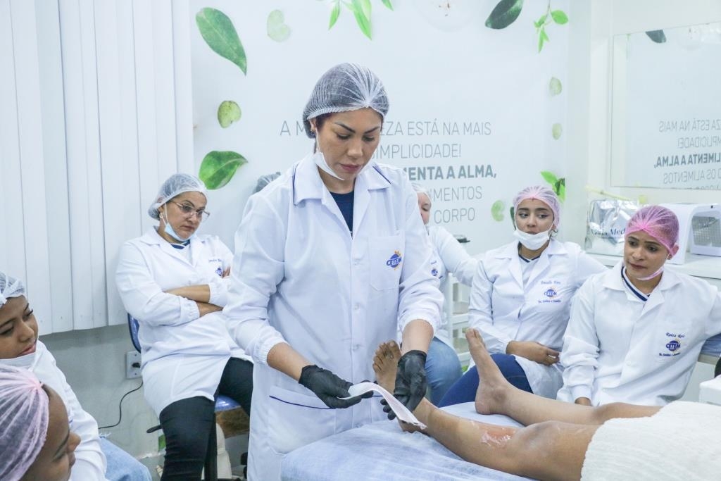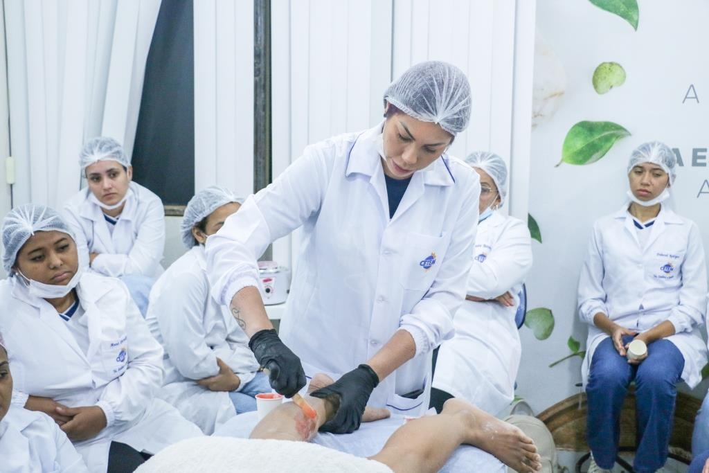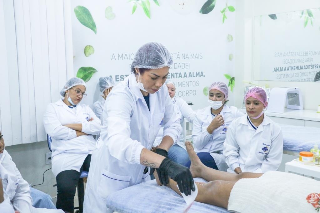 Aula prática de epilação com a turma do curso Técnico em Estética