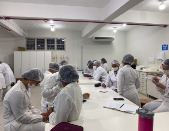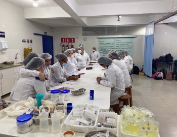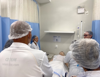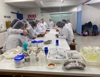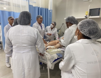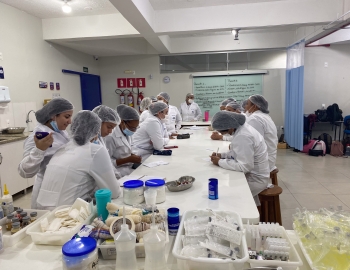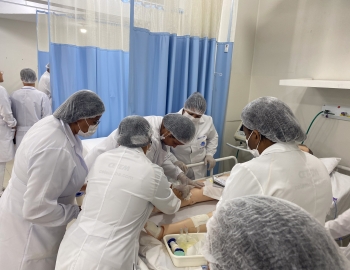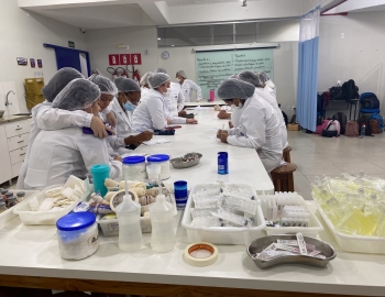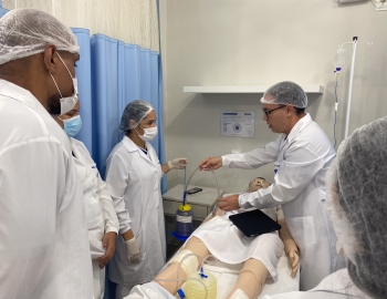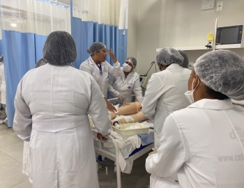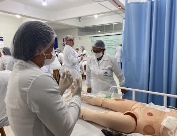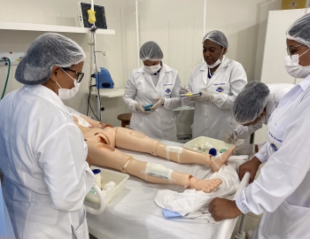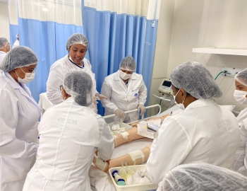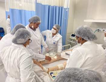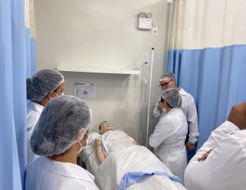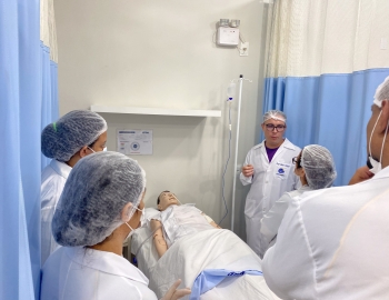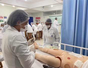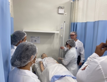 Turma 320D do curso Técnico em Enfermagem em aula prática do bloco UTI, aprendendo práticas de cálculo de medicamentos, curativos/ curativo de dreno, orientados pelo professor Abner.