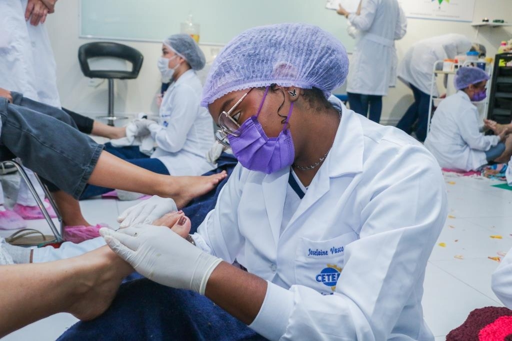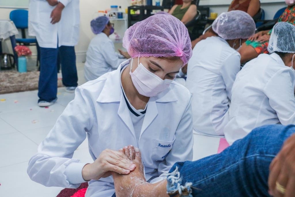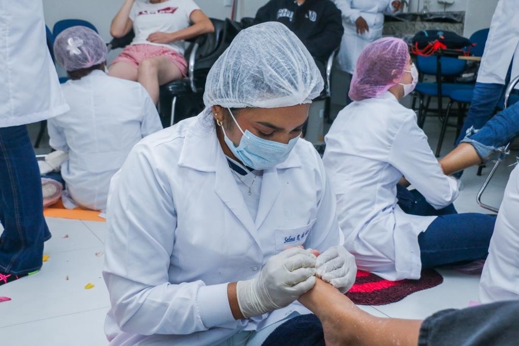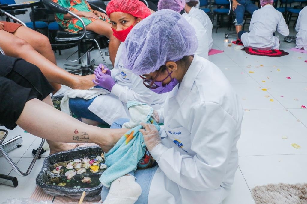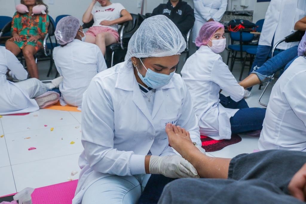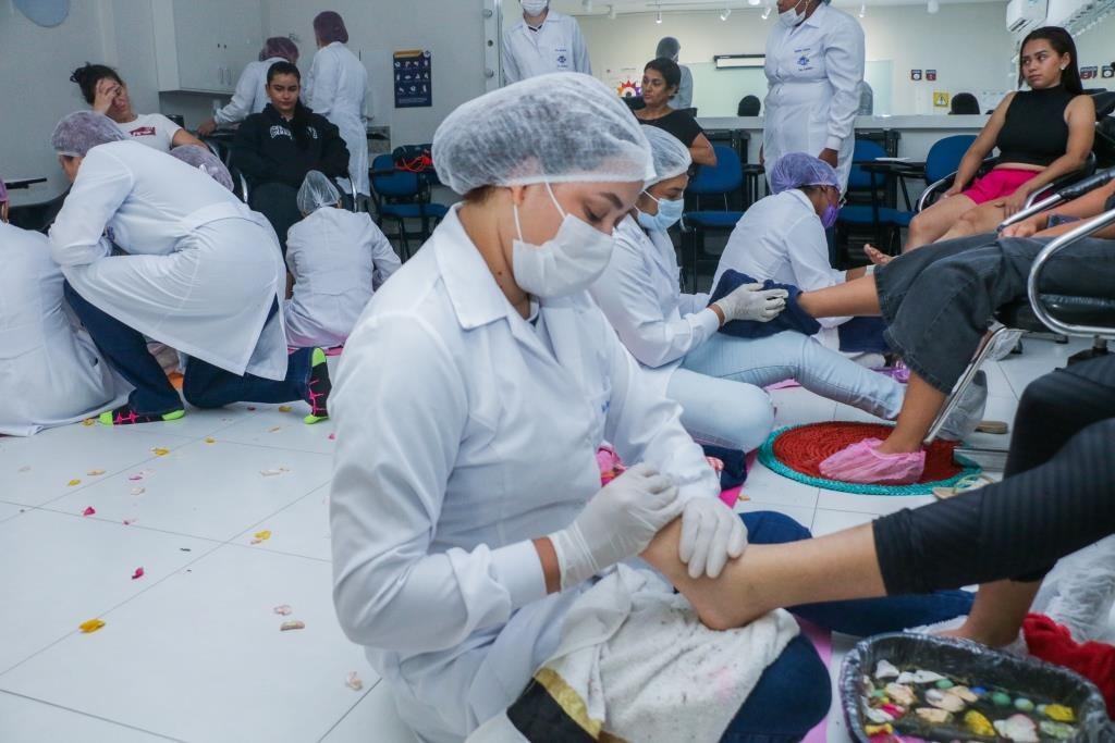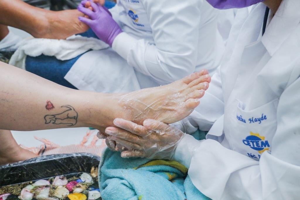 Registro da aula prática da Turma 642 (Técnico em Estética) explorando as Técnicas Spazianas. O escalda-pés é o primeiro passo para um protocolo de relaxamento inesquecível.