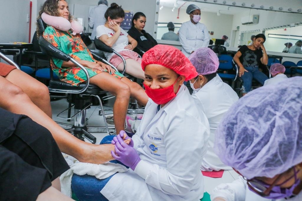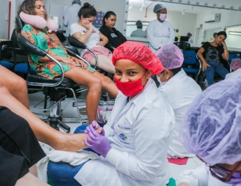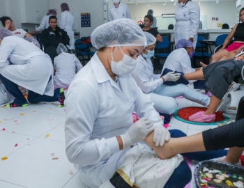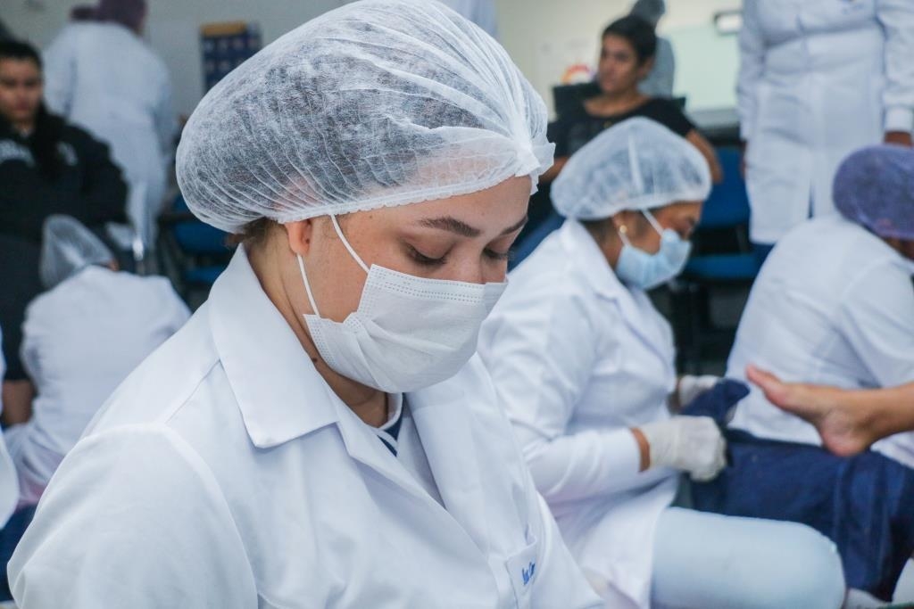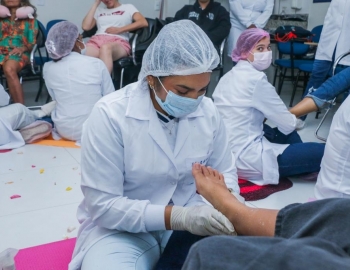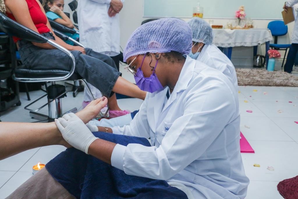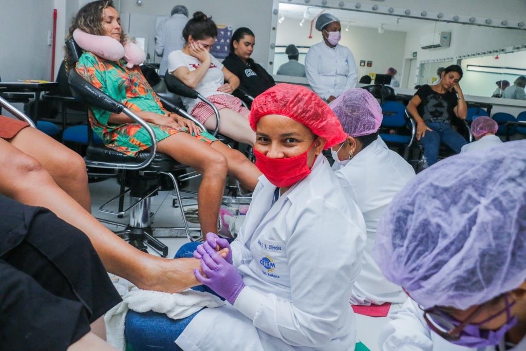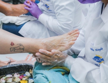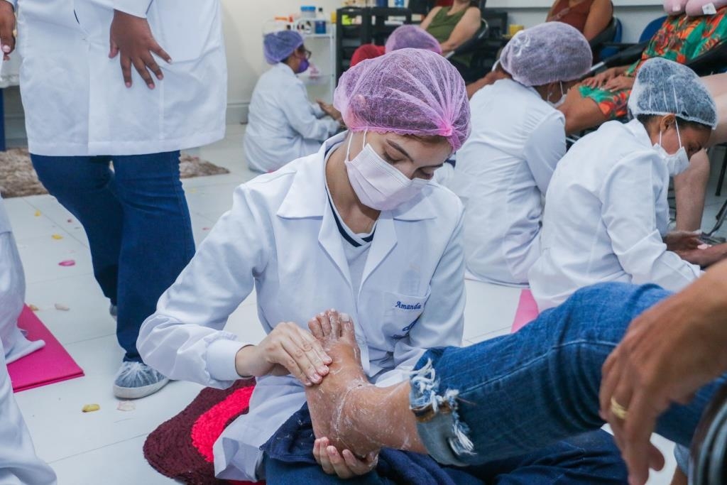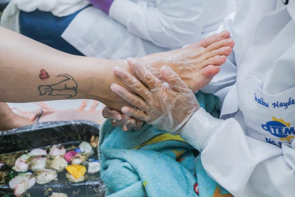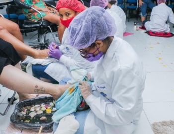 Registro da aula prática da Turma 642 (Técnico em Estética) explorando as Técnicas Spazianas. O escalda-pés é o primeiro passo para um protocolo de relaxamento inesquecível.