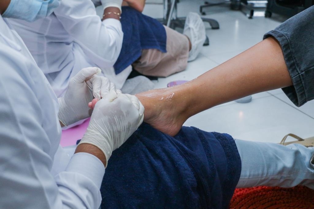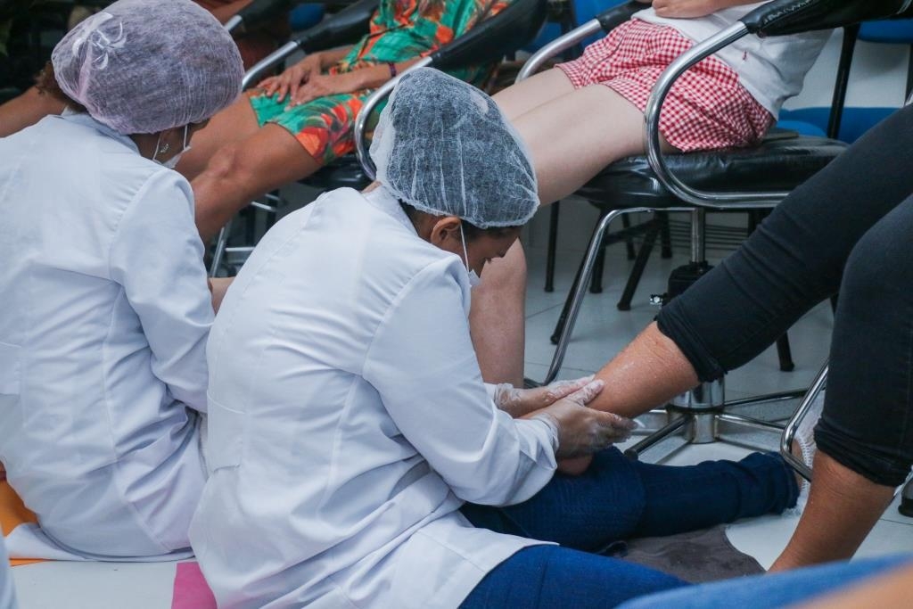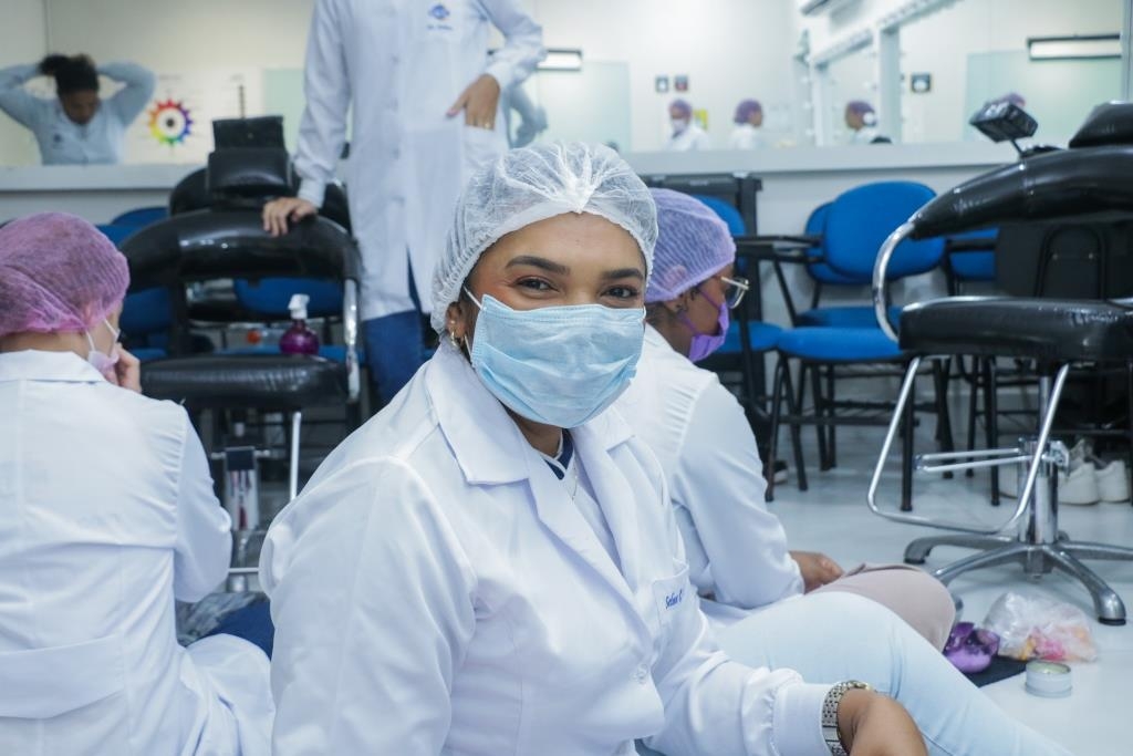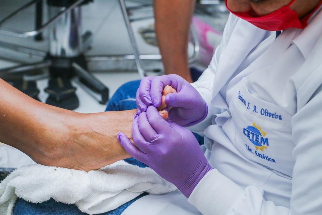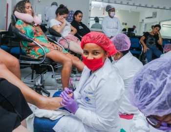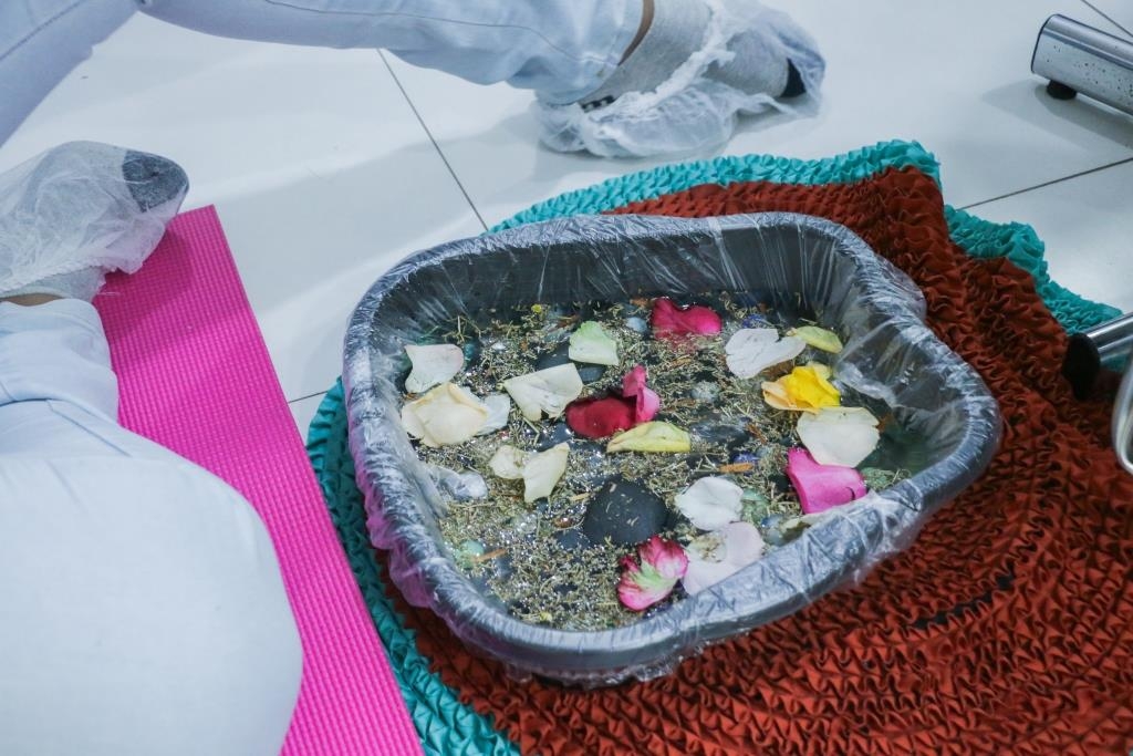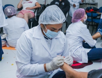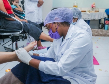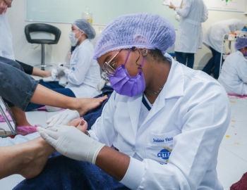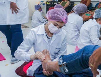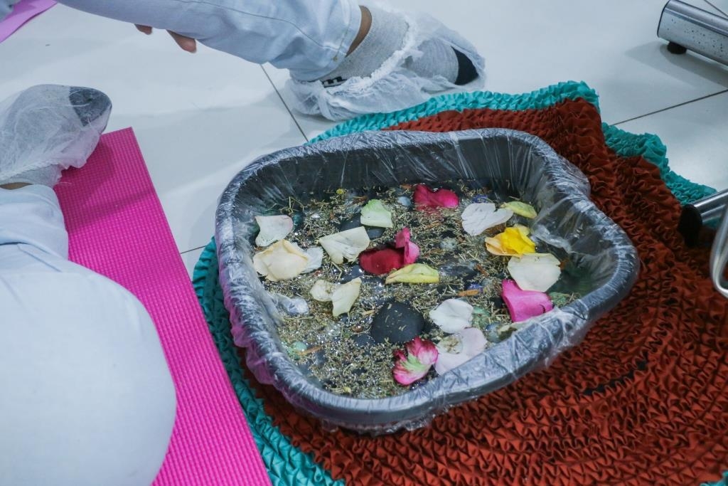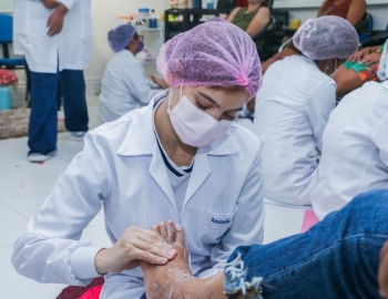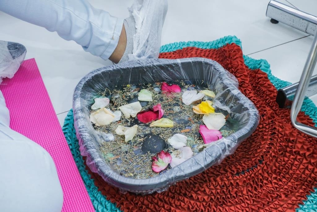 Registro da aula prática da Turma 642 (Técnico em Estética) explorando as Técnicas Spazianas. O escalda-pés é o primeiro passo para um protocolo de relaxamento inesquecível.